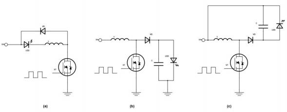 Figure 2-(b) shows an LED driver circuit using a Boost converter, which boosts the output voltage to a desired value higher than the input voltage through inductor energy storage, enabling LED driving under low input voltage.