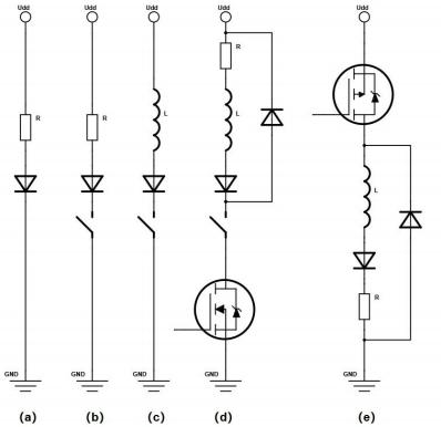 (a) Regulating LED current using a series resistor (b) Circuit controlling LEDs with programmable duty cycle (c) Circuit using low-side switch (switch mode method) (d) Implementation with freewheeling diode (e) Using high-side switch