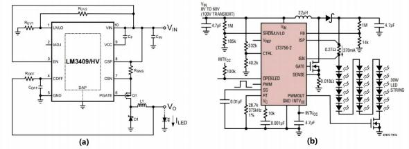 Figure 7 shows two commonly used LED driver chips. LM3409 is a buck-controlled high-power LED driver, and LT3756 is an LED driver IC that supports three driving modes (buck, buck-boost, boost). LM3409 is paired with a PMOS transistor, and LT3756 is paired with an NMOS transistor. It can be seen that LED driver ICs and MOSFETs are commonly combined; of course, some low-power driver chips do not require an external MOSFET, as the built-in MOSFET is sufficient to meet their driving requirements.